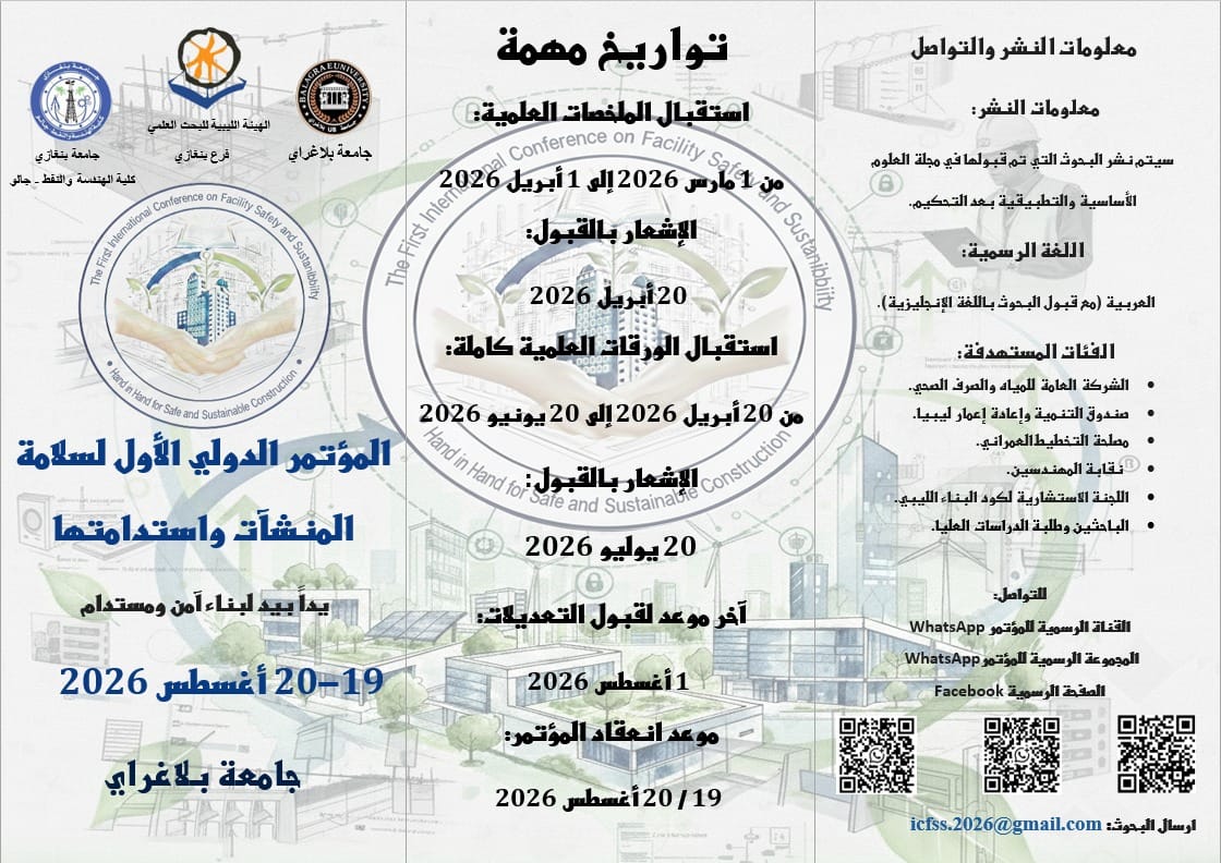 - المنظمون: جامعة بلاغراي، الهيئة الليبية للبحث العلمي (فرع بنغازي)، كلية الهندسة والنفط جالو – جامعة بنغازي.