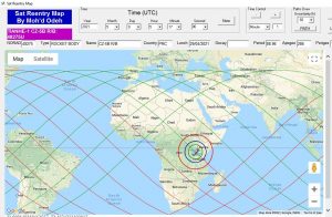 هذا وتشير الخارطة المرفقة إلى أن موقع سقوط القمر الصناعي المتوقع يوم 09 مايو في الساعة 05:17، هو في وسط أفريقيا، وتشير الخطوط الخضراء والحمراء إلى الأماكن التي قد يسقط فيها القمر الصناعي ضمن هامش خطأ مقداره زائد ناقص 10 ساعات. وبكل تأكيد ستتغير هذه الخريطة بمرور الوقت، وكلما اقتربنا من موعد السقوط سيقل هامش الخطأ وستقل الأماكن المرشحة ليسقط الحطام فوقها، ولكن بكل تأكيد حتى قبل ساعتين من موعد السقوط لا يمكن تحديد المكان والوقت بشكل دقيق، فعادة يكون أقل هامش خطأ هو بحدود زائد ناقص ساعة واحدة، وإذا علمنا بأن الحطام هذا يلف الكرة الأرضية مرة واحدة كل 89 دقيقة فهذا يعني أن هامش خطأ مقداره ساعتين يعني أن هناك مناطق شاسعة ستبقى مهددة بسقوط القمر الصناعي فوقها. وسيقوم مركز الفلك الدولي بمشيئة الله بنشر تحديثات موعد ومكان سقوط القمر الصناعي المتوقعة تباعا من خلال حسابه الرسمي على تويتر وانستغرام، مرفقة بالخريطة المحددة لمكان السقوط.