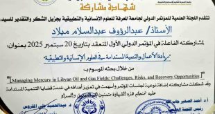 شارك عضو هيئة التدريس والباحث الأكاديمي بديوان الهيئة الليبية للبحث العلمي والمسكن بالمشروع الوطني لدراسات عمليات واقتصاديات النفط والغاز، أ.م. عبدالرؤوف عبدالسلام ميلاد جبريل، في فعاليات المؤتمر الدولي لجامعة المعرفة للعلوم الإنسانية والتطبيقية للدراسات الحديثة في دورته الأولى، المنعقد يوم السبت الموافق 20 سبتمبر 2025م، تحت عنوان: «ريادة الأعمال والتنمية المستدامة في العلوم الإنسانية والتطبيقية». وقد جاءت مشاركة الباحث ضمن …