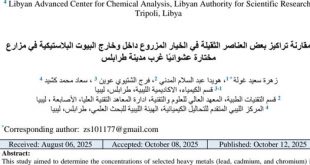 نقلا عن المركز الليبي المتقدم للتحاليل الكيميائية . و يستمر العمل و النشر العلمي # نشر ورقة بحثية جديدة # عنوان الدراسة : “مقارنة تراكيز بعض العناصر الثقيلة في الخيار المزروع داخل و خارج البيوث البلاستيكية في مزارع مختارة عشوائيا في غرب مدينة طرابلس “ ملخص الدراسة هدفت هذه الدراسة إلى تعيين تركيزات بعض العناصر الثقيلة (الرصاص، الكادميوم، والكروم) في …