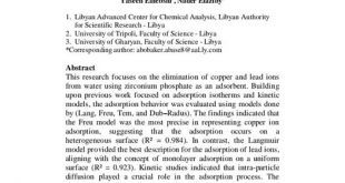 نقلا عن المركز الليبي المتقدم للتحاليل الكيميائية. # نشر ورقة بحثية # الملخص: تُعدّ مشكلة تلوث المياه بالمعادن الثقيلة مثل النحاس والرصاص من أبرز القضايا البيئية التي تهدد صحة الإنسان واستدامة النظم البيئية، الأمر الذي يستدعي تطوير مواد فعّالة لمعالجة هذه الملوثات. في هذه الدراسة تم استخدام فوسفات الزركونيوم كمادة ماصّة لإزالة أيونات النحاس والرصاص من المحاليل المائية، حيث تم …