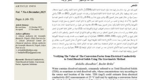 المركز الليبي المتقدم للتحاليل الكيميائية . نشر ورقة بحثية جديدة تحتوي المياه على معادن مذابة يشار إليها عادة بالمواد الصلبة الذائبة الكلية (TDS) أو الأملاح الذائبة الكلية، وتختلف كميتها باختلاف مصدر المياه وموقعها. يمكن تقدير المواد الصلبة الذائبة الكلية (ملغم/لتر) من قياسات التوصيل الكهربائي (EC) عند 25°م (مللي سيمنز/سم) من خلال تطبيق معامل التحويل (f)، والذي يتراوح عادةً بين 0.54 …